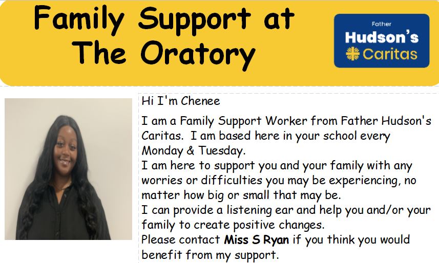 We are proud to have a Family Support Worker (Chenee Fuller) in school two days a week, who is available to work directly with children and families. We also work with many external support agencies such as Ladywood Community Project; Karis Baby Bank; Ladywood Early Help Locality and Compass Mental Health Support. At The Oratory, we will always do our best to help and are happy to reach out to any service that can support your child and family. If you are ever unsure or need a listening ear, please come and speak to us — we are here for you!
